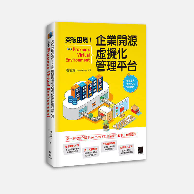 | | | 突破困境!企業開源虛擬化管理平台:使用 Proxmox Virtual Environment 本書是作者將累積近十年Proxmox VE實務經驗的成果轉化,把自身在企業導入應用的心得,以及協助客戶建置虛擬化管理系統的案例編寫成冊,並搭配大量詳細步驟的圖文教學,可提供有興趣採用其他虛擬化管理平台產品的使用者入門。