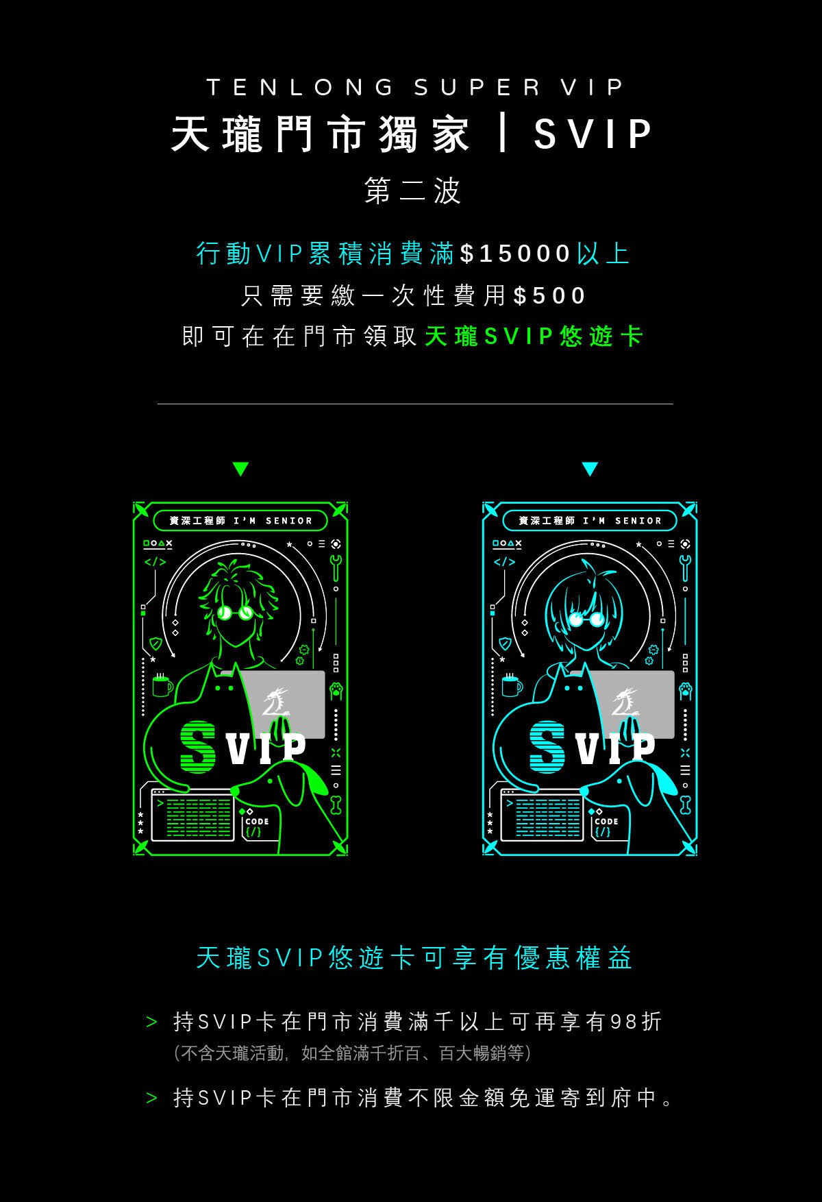 行動 VIP 累積消費滿 NT15000 以上, 只需要在門市繳一次性費用 NT500, 即可在門市領取天瓏 SVIP 卡!