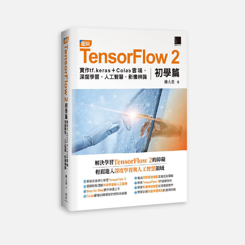 | | | 圖解TensorFlow 2初學篇:實作tf.keras + Colab雲端、深度學習、人工智慧、影像辨識 繼台灣人工智慧領域最暢銷著作《TensorFlow+Keras深度學習人工智慧實務應用》之後,大數據分析大師、暢銷名作家 林大貴最新力作《圖解TensorFlow 2初學篇:實作tf.keras + Colab雲端、深度學習、人工智慧、影像辨識》嶄新登場!解決學習TensorFlow 2的障礙,輕鬆進入深度學習與人工智慧領域!TensorFlow 2是最受歡迎的「人工智慧與深度學習」平台,學會了TensorFlow 2,對於你的現有工作提升與未來轉職都有很大的幫助,然而多數人在學習過程中卻遇到了很多困難,而本書能解決學習TensorFlow 2的障礙。
