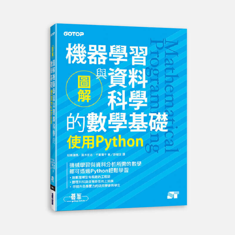 | | | 圖解機器學習與資料科學的數學基礎|使用 Python 本書透過圖表解說人工智慧與資料科學領域的相關數學知識,並告訴你如何將其轉換為程式碼,除了可以吸收關於數學的知識之外,也能立即運用在工作上。本書將AI與資料科學的相關數學知識分成四大篇,第一篇的「機率統計、機器學習篇」介紹的是了解工作情況,篩選出必要資訊的流程,以及位於這個流程背後的機率統計、機器學習的數學知識。能掌握工作情況就能知道該如何改善相關業務...