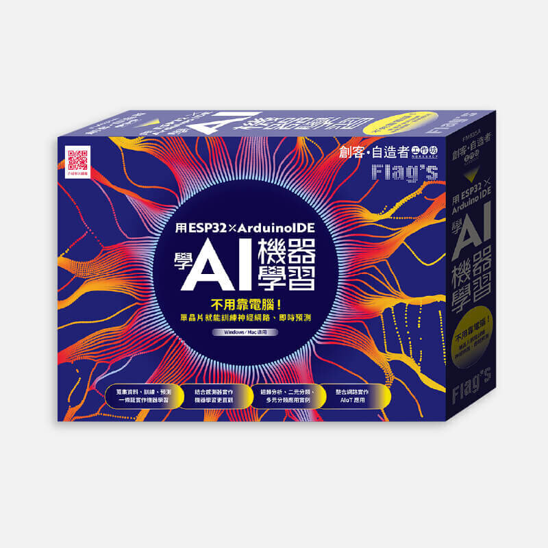 | FLAG'S 創客‧自造者工作坊 -- 用 ESP32 × Arduino IDE 學 AI 機器 學習 不用靠電腦!單晶片就能訓練神經網路、即時預測!一般初學機器學習, 都是使用別人準備好的資料集, 並在電腦上進行訓練、預測教材上設計好的題目, 像是套好招一樣, 即使結果正確, 卻沒有太高的真實感。加上解決的問題常常離我們太遙遠, 像是其他國家城市的物價預測、英文評論的分類等等, 練習起來也較缺乏臨場感