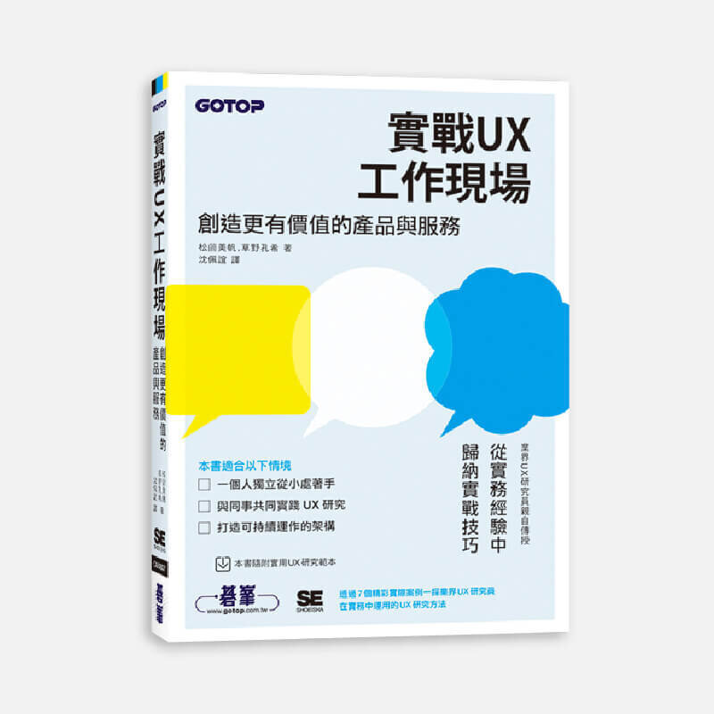 這是一本實踐使用者經驗(UX)研究的入門書。「聽說過『UX研究』這個詞,但不太清楚具體內容⋯⋯」、「我想嘗試一下UX研究,應該從何處開始好呢⋯⋯」除了腦中出現這類想法的人以外,還有一些人的煩惱是:「雖然已經開始進行UX研究了,但說真的,我對實作方法沒有自信⋯⋯」。筆者希望能為這些人提供助力,因此將實務工作中獲得的UX知識與洞察統整成一本書。當讀者準備踏出第一步,或是持續進行UX研究時,都能將這本書當作如同導師的存在,放在身邊隨時翻閱參考。