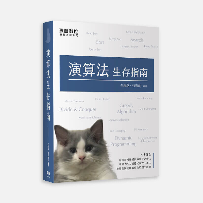本書挑選出最實用、出現頻率最高的演算法及相關例題,並以C++實作,透過實作來了解每一種演算法的流程,同時每章節後皆附上 LeetCode 或 APCS考古題與線上批改系統連結供讀者練習。本書挑選出最實用且出現頻率最高的演算法,並附上每個演算法的步驟圖解與實作程式碼。每章節後皆附上LeetCode APCS考古題與線上批改系統連結供讀者練習。