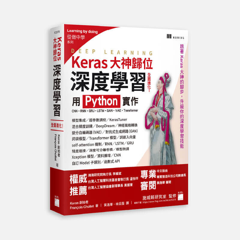 | | - 推薦書 Book Recommendations - | | Keras 大神歸位:深度學習全面進化 本書由 Keras 創始者親自撰寫,沒人比他更了解Keras這套工具,雖然如此,但這並不是一本 Keras 的使用手冊,而是帶你從頭開始探索深度學習,進而拓展對深度學習理解的經典之作。