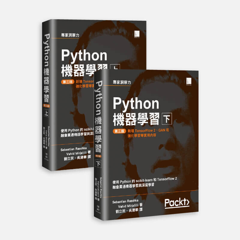 | | | Python 機器學習 (上)(下) 循序漸進、由淺入深,好評熱銷再進化!最新修訂的《Python機器學習第三版》是一本不容錯過的全方位指南,也是讀者在建立機器學習系統時的必備參考。