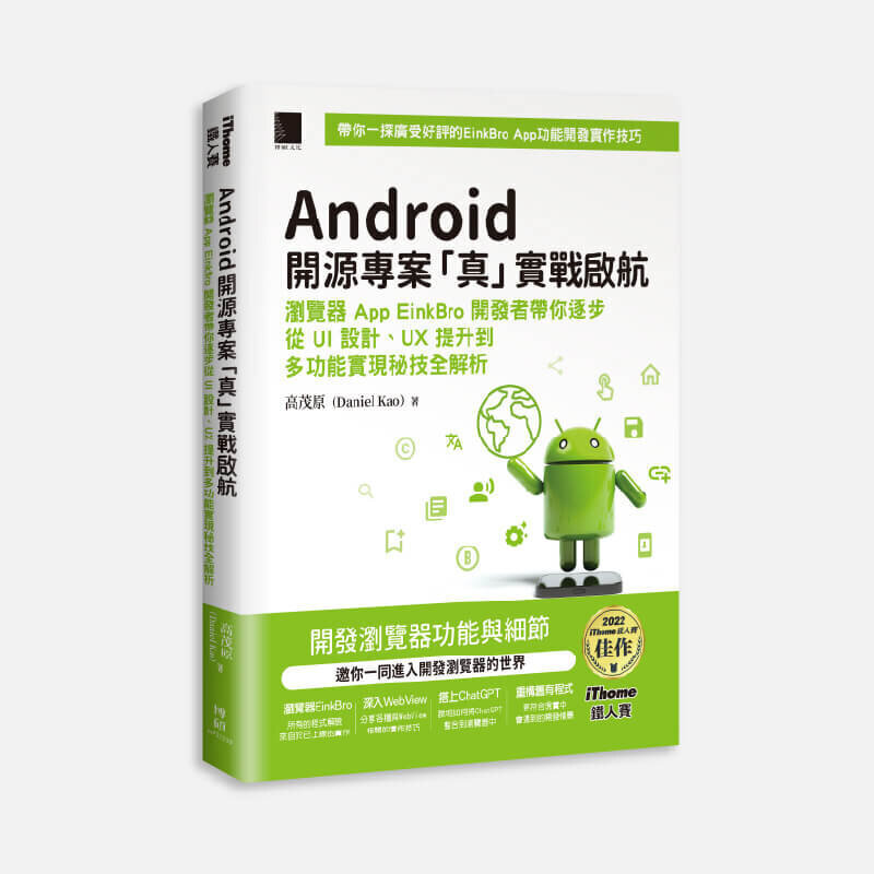 | | | Android 開源專案「真」實戰啟航:瀏覽器 App EinkBro 開發者帶你逐步從 UI 設計、UX 提升到多功能實現秘技全解析 不同於以往的 Android 教學書籍,本書以實際 App 專案的開發先後順序介紹各種不同主題和功能的實作,讓讀者能夠隨著專案的演進,感受到它一步步改善的過程。