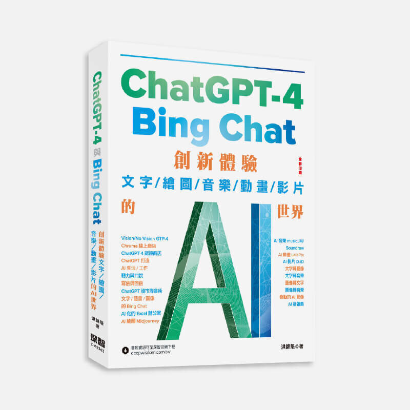 | | | ChatGPT-4 與 Bing Chat - 創新體驗文字/繪圖/音樂/動畫/影片的AI世界 ChatGPT-4 與Bing Chat創新體驗。這本書不會涉及較深的程式設計技術細節,而是著重於如何在實際場景中使用和應用ChatGPT 與 Bing Chat。
