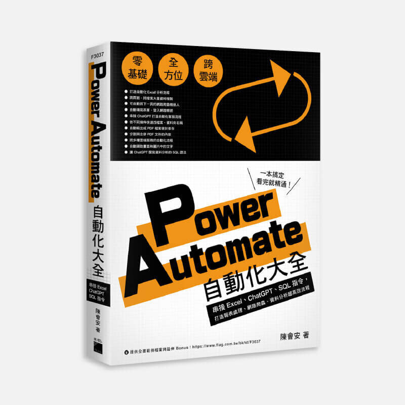 | | | | • 統統交給 Power Automate 就搞定了 | Power Automate 自動化大全:串接 Excel、ChatGPT、SQL 指令,打造報表處理、網路爬蟲、資料分析超高效流程 本書是市面上最完整的 Power Automate 專書, 教導你如何善用各種內建功能, 搭配 Excel、ChatGPT 和 SQL 查詢語法, 將日常工作打造成簡便的自動化程序。
