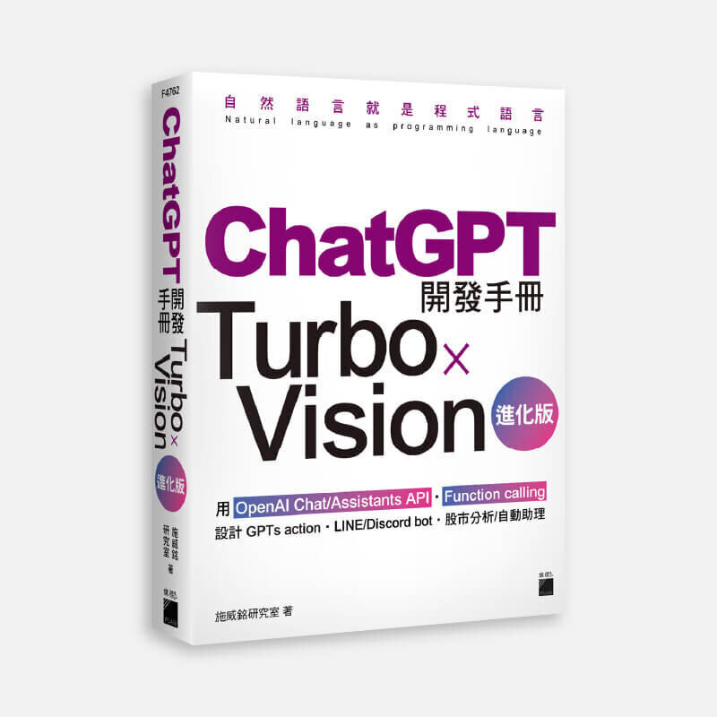 | | | ChatGPT 開發手冊 Turbo×Vision 進化版 不想被語言模型弄瘋, 就要瞭解OpenAI API的各項參數, 掌握語言模型生成的各種變數, 怎樣讓語言模型生成內容避開不想要出現的字詞?