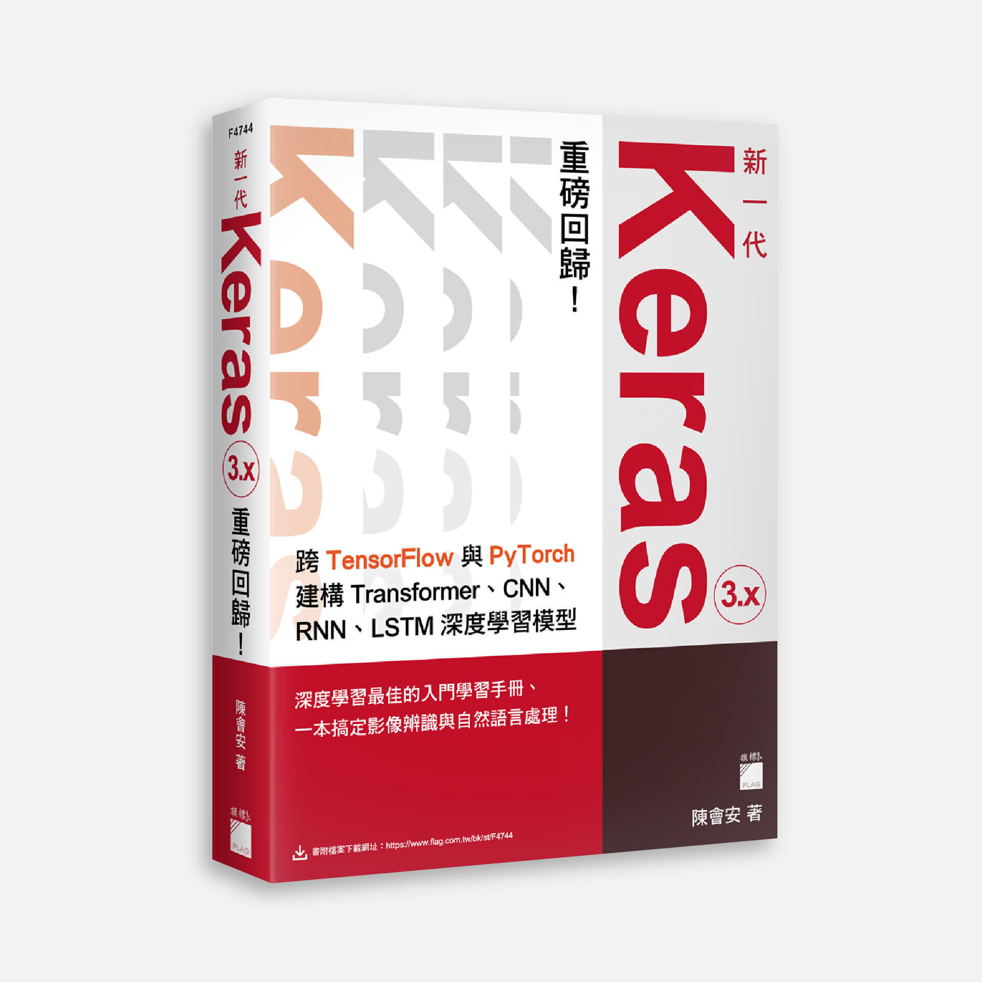 | | - 新書推薦 New Book Releases - | | 新一代 Keras 3.x 重磅回歸 本書以淺顯易懂的方式與大量圖例介紹深度學習的理論基礎,並使用 Keras 3 來建構 MLP、CNN、RNN、LSTM、GRU、Transformer 模型,實作多種熱門分類、迴歸問題...