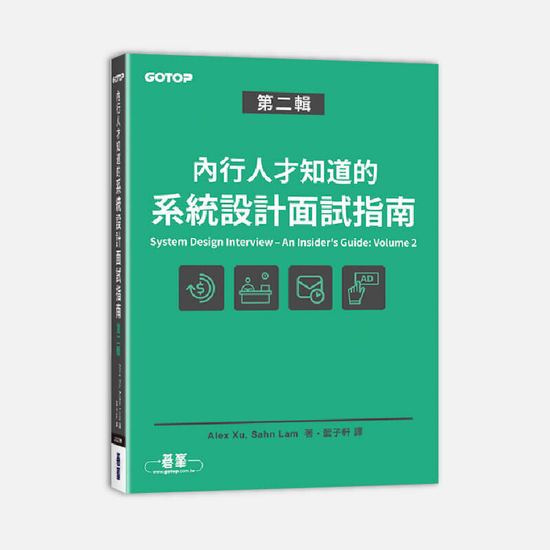 | | - 新書推薦 New Book Releases - | | 內行人才知道的系統設計面試指南 第二輯 本書為《內行人才知道的系統設計面試指南》的續作,收錄全新的系統設計面試問題與解決方案。