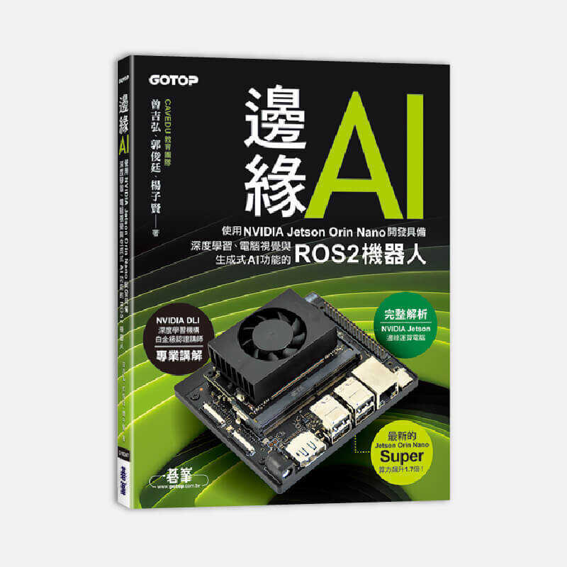 | | | 邊緣 AI-使用 NVIDIA Jetson Orin Nano 開發具備深度學習、電腦視覺與生成式 AI 功能的 ROS2 機器人 完整解析 NVIDIA Jetson 邊緣運算電腦,最新的 Jetson Orin Nano Super 算力飆升1.7倍!