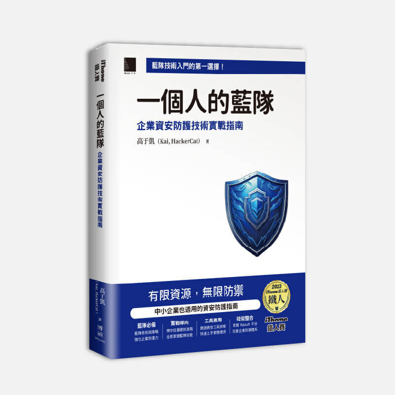 | | | 一個人的藍隊:企業資安防護技術實戰指南(iThome鐵人賽系列書) 針對中小企業與資源有限的環境,提出具體可行的解決方案,以實戰導向逐步介紹藍隊技術的核心概念與實作方法,涵蓋防禦策略、威脅情資、弱點管理、安全監控。