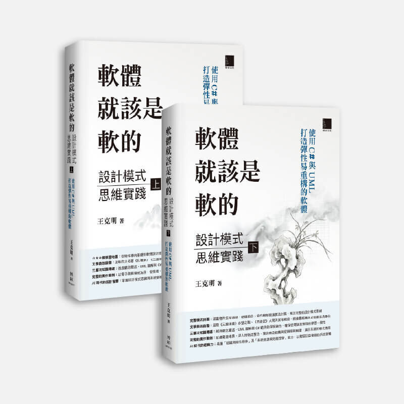 | | - 新書推薦 New Book Releases - | | 軟體就該是軟的:設計模式思維實踐 (上|下) — 使用 C# 與 UML 打造彈性易重構的軟體 本書的核心理念是:學習設計模式,重點不在僵化的程式模板,而在於背後的「設計思維」——懂得如何「為變化而設計」。