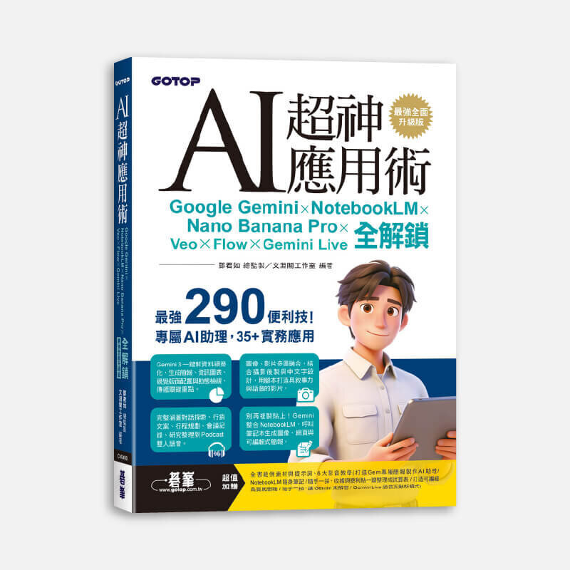 | | | AI 超神應用術:Google Gemini × NotebookLM × Nano Banana Pro × Veo × Flow × Gemini Live 全解鎖 完整解析Google AI超進化應用工具,協助你在知識整理、文案撰寫、影音創作與互動設計上全面升級...